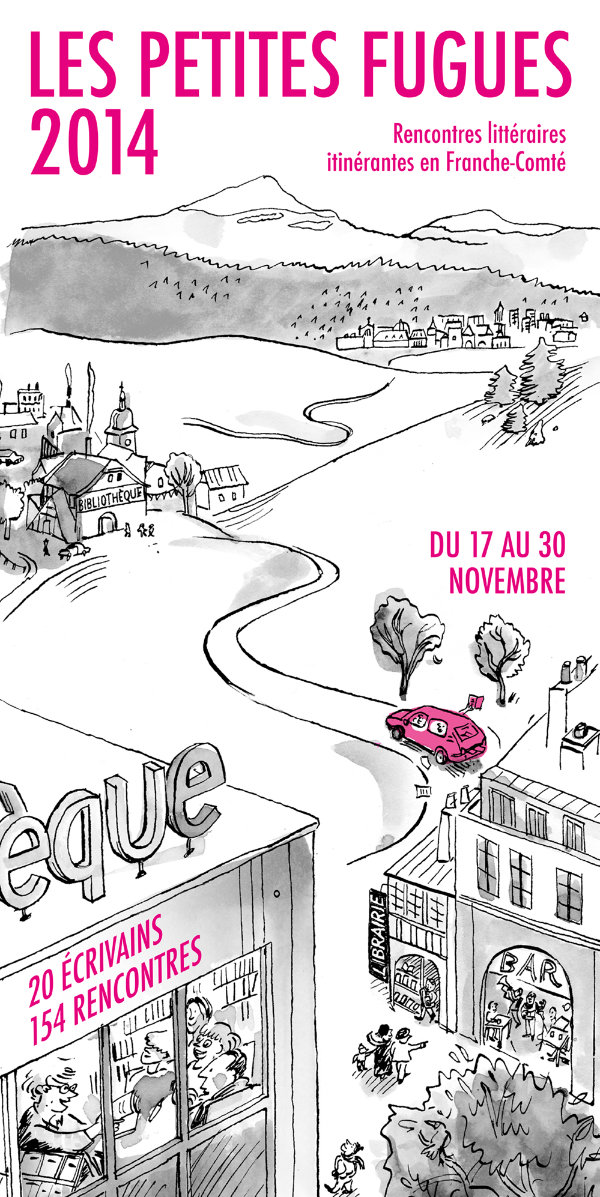 J’ai réalisé l’affiche et la couverture du programme du festival littéraire de Franche-Comté Les Petites fugues 2014. Une commande du Centre Régional du Livre de Franche-Comté.